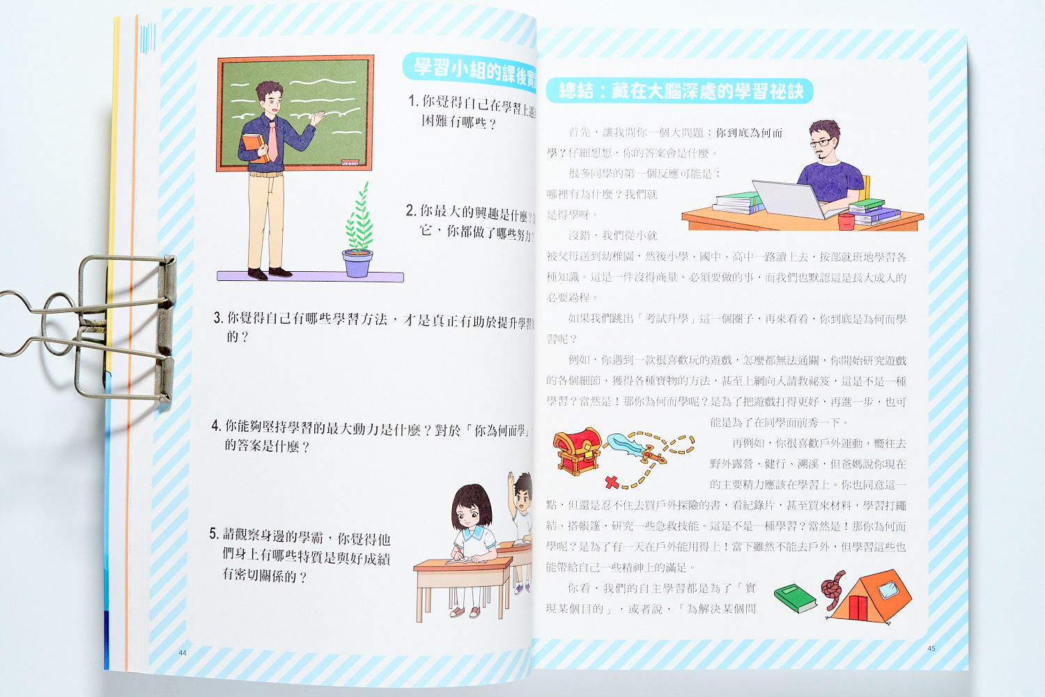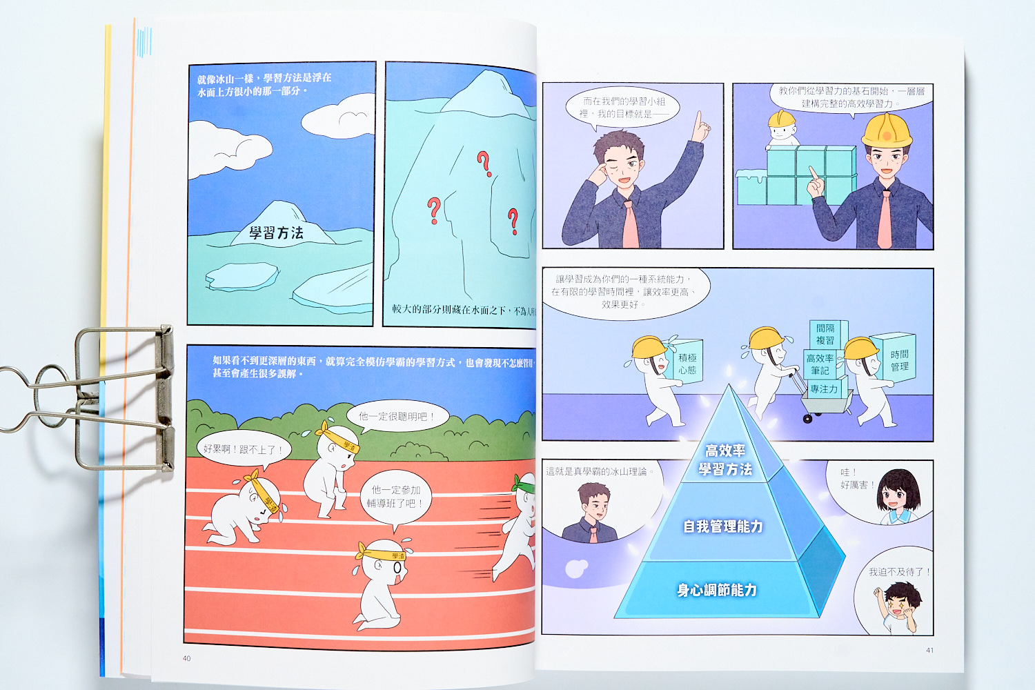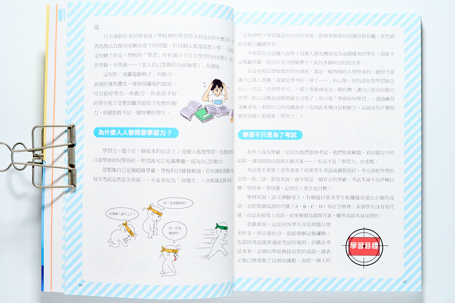 書裡的寫法並不是那種很『補習班』的教法,而是都會向孩子解釋這些能力背後都和人類的心理、情緒、大腦功能有關。因此,我們成績或是課業表現不好,不是我們不聰明,而是沒有掌握好我們的心理狀態。